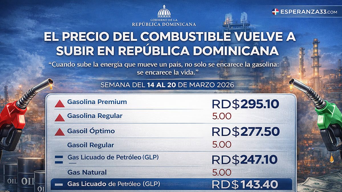 El Ministerio de Industria, Comercio y Mipymes anunció los precios correspondientes a la semana del 14 al 20 de marzo de 2026, confirmando un aumento de RD$5.00 por galón en los principales carburantes utilizados por la población.
