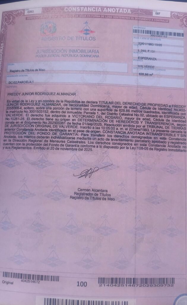 Según la denuncia, la emisión de una Constancia Anotada documento legal dentro del sistema inmobiliario dominicano estaría siendo utilizada como instrumento en un proceso que, lejos de responder al interés colectivo, podría beneficiar intereses particulares. La preocupación se intensifica al mencionarse que el nombre vinculado al documento corresponde a un familiar directo del actual alcalde del municipio.